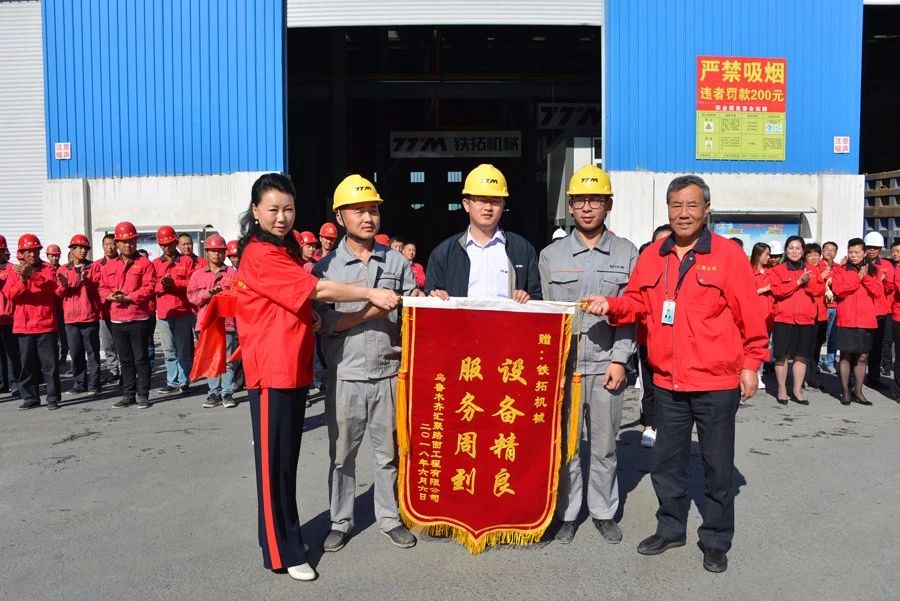 剪彩儀式結(jié)束后,隋思玉董事長親自贈予鐵拓機械“設(shè)備精良,服務(wù)周到”紅色大錦旗,對鐵拓機械在項目實施過程的各項工作給以肯定。